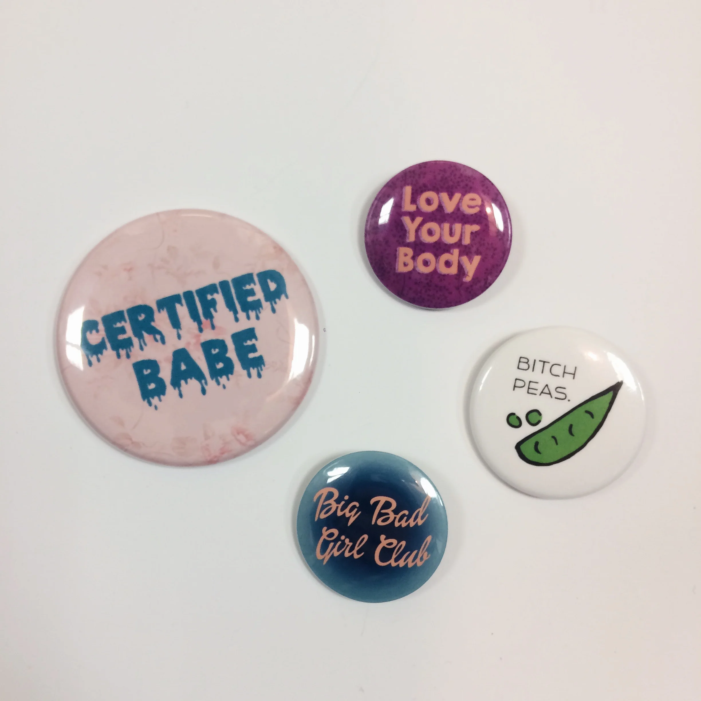 "Love Your Body", "Bitch Peas", & "Big Bad Girl Club" pins, $2 each