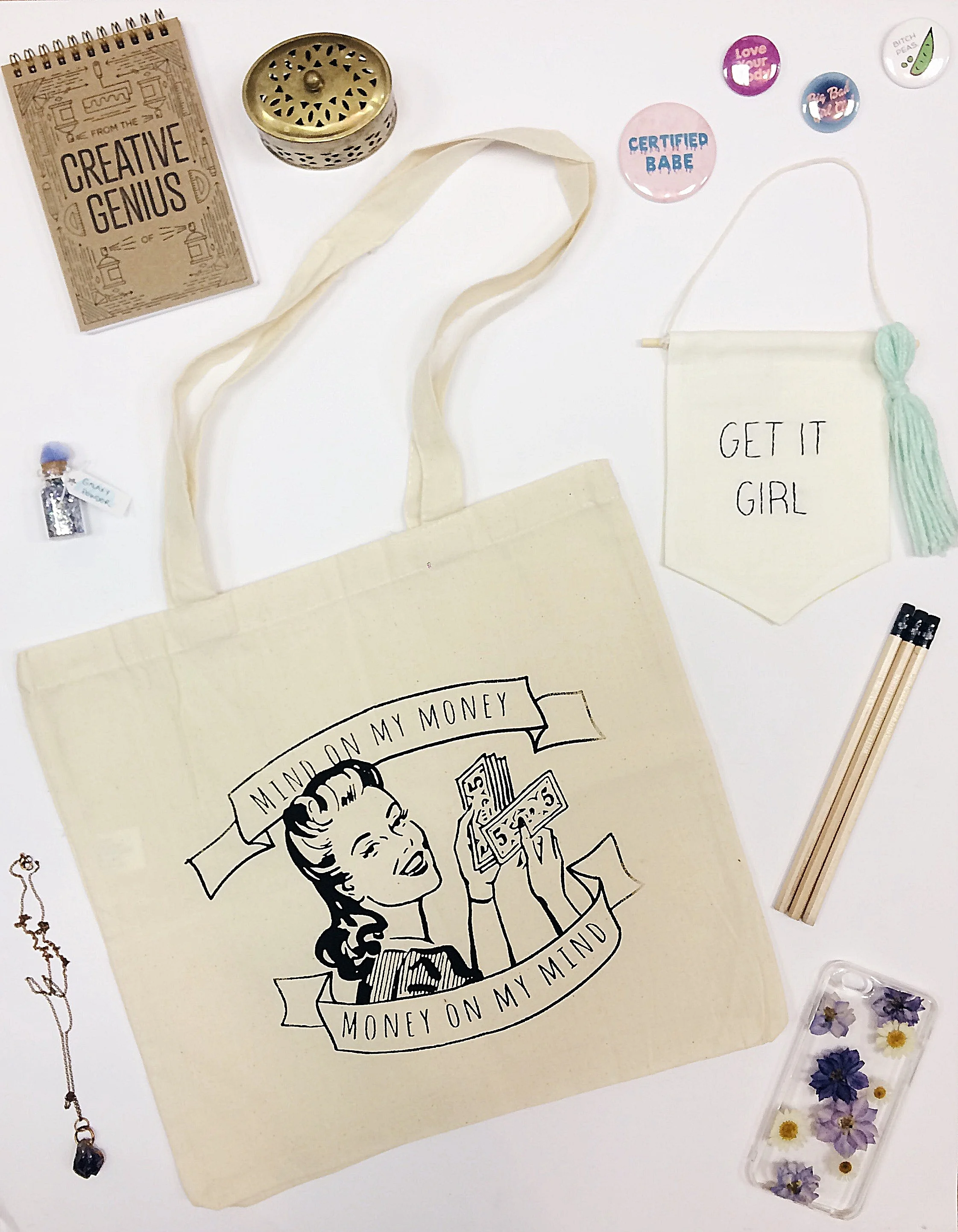 Creative Genius notebook, $8 "Get It Girl" wall banner with tassel, $20
